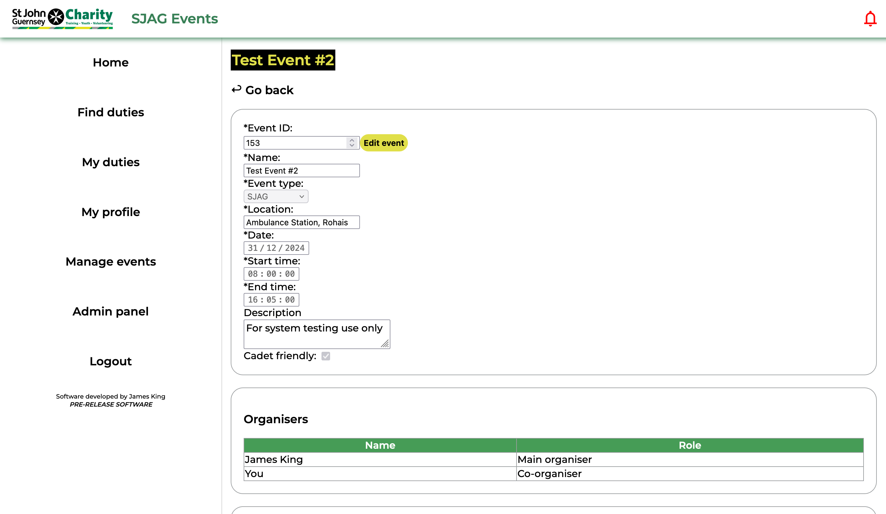 The third box shows all the duty requirements for that event, with each requirement having its own timeline. Duties that are booked for that requirement are displayed on the timeline, indicating at a glance what times need to be covered. Bookings that have been approved by an event organiser are displayed on a grey background, and unapproved duties on a yellow background.