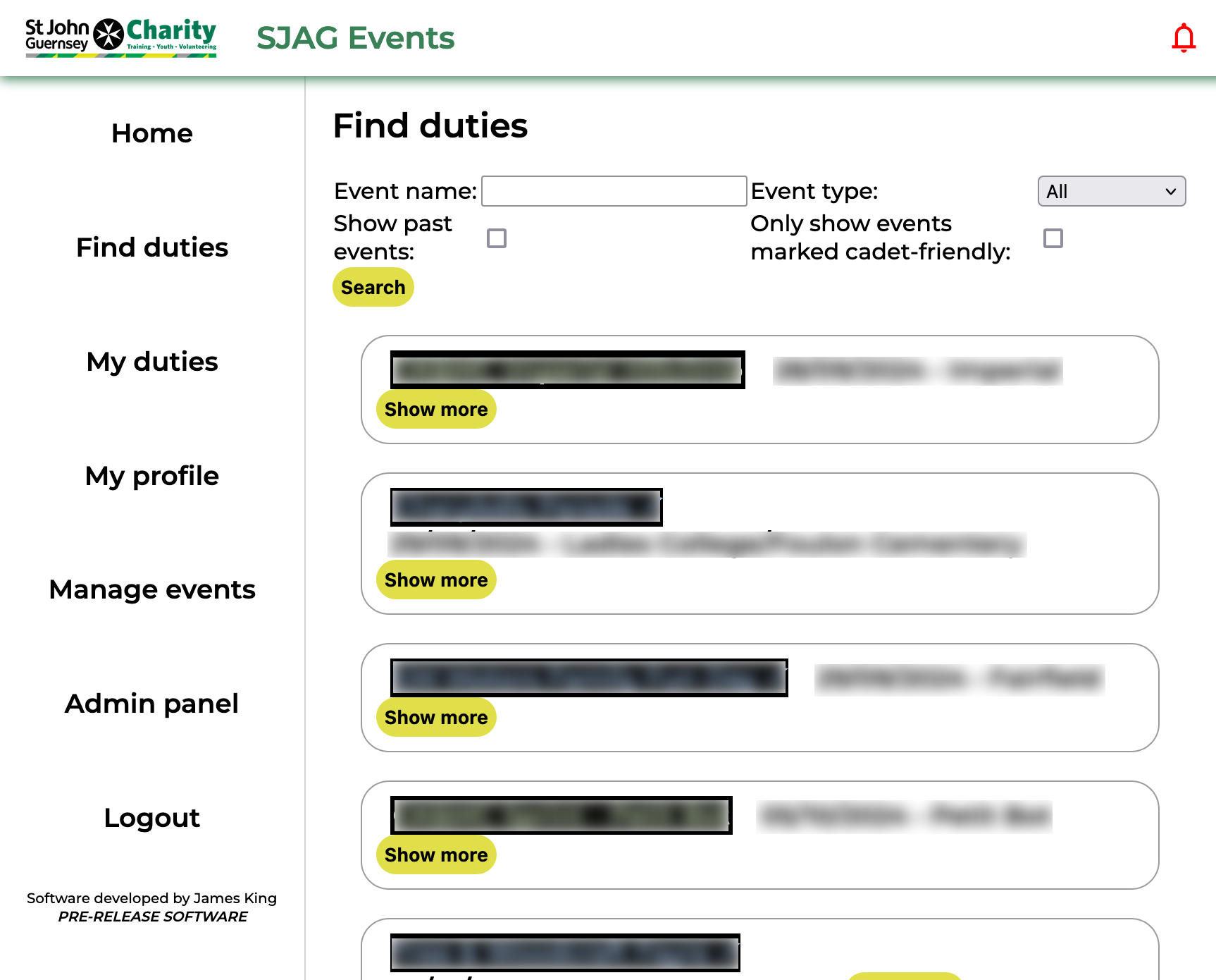 The find duties page displays all available duties on the system. From here, you can search through events to find duties to book onto.