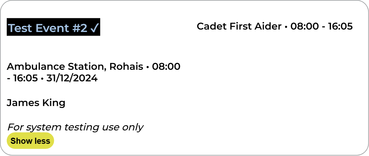 Duty names are colour coded according to the type of event, using the same key as the paper duty lists: SJAG in blue, EAS in green, and joint events in red. Events may also display a check mark in their name; this indicates that the event has been marked as cadet friendly, and that cadets are able to sign up for that duty if they wish.