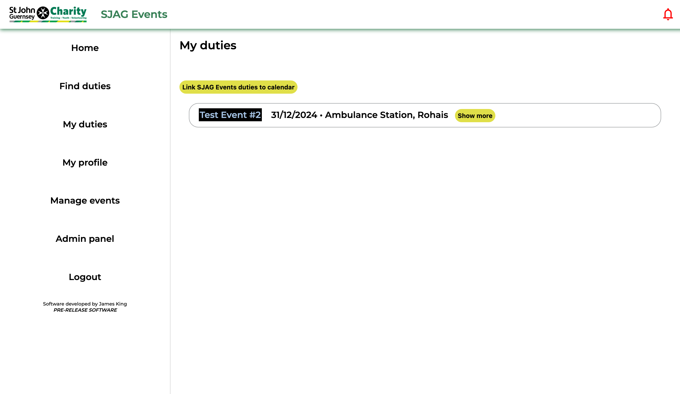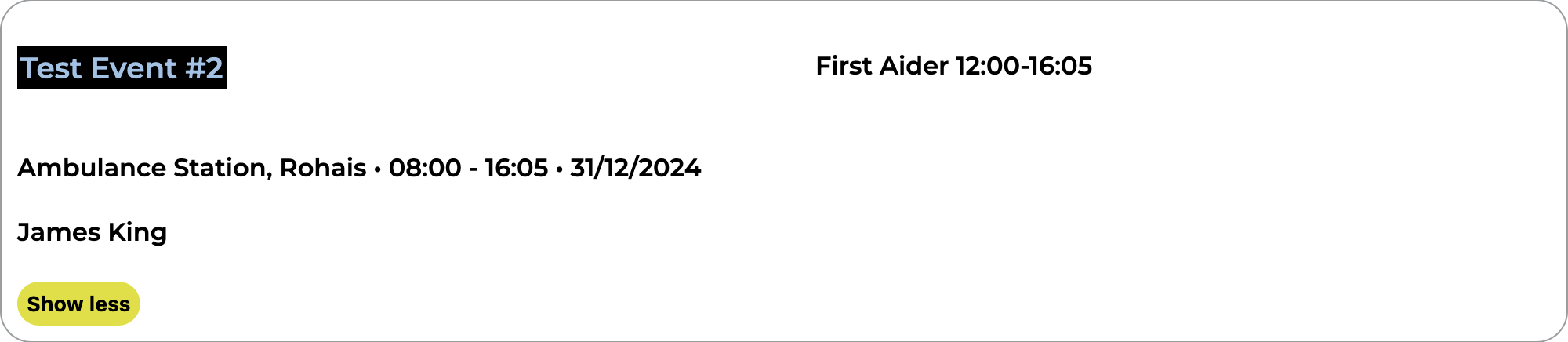 Each event is displayed in an "info-bubble". To prevent overcrowding, these are collapsed by default, only showing basic information. Clicking on the 'Show more' button will expand the bubble to show more information.