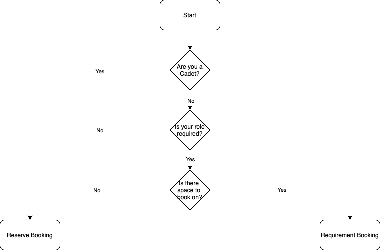 Reserve bookings are found in the 'Reserves' section of the event page. Unlike requirement bookings, the roles and times are not set by the event organiser. Instead, it is up to the user to propose a duty for the organiser to accept. The organiser in turn is then able to either accept, deny, or modify the users bookings. If they choose to modify the booking, the user will then be prompted to themselves accept, deny, or modify - this continues until both party confirm to a booking. Reserve bookings are intended to be used when a user is unable to book on as a requirement booking, for instance if there is already sufficient cover, or if they do not have a required role (such as an Observer, BFA or Nurse who would not be accounted for in the minimum event cover). Reserve bookings are also used by cadets.